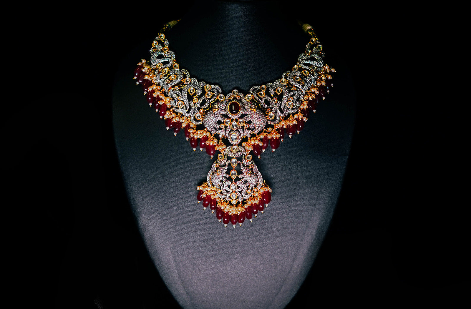 Victoria Finish Necklace Set | Peacock Design | CZs, Ruby Stones and Strawberry beads