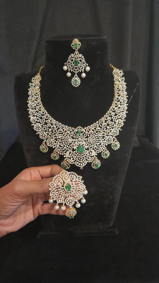 Diamond Finish Emerald Haram Set, Detachable Pendent