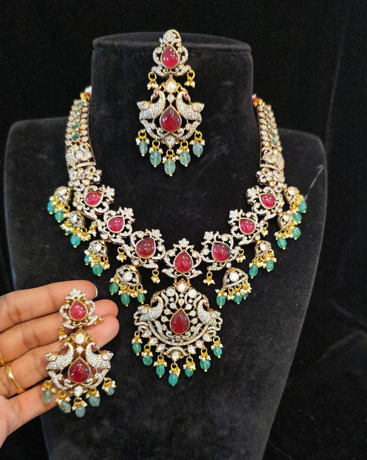 Victorian CZs, Russian Green Stones, Ruby beads Necklace Set