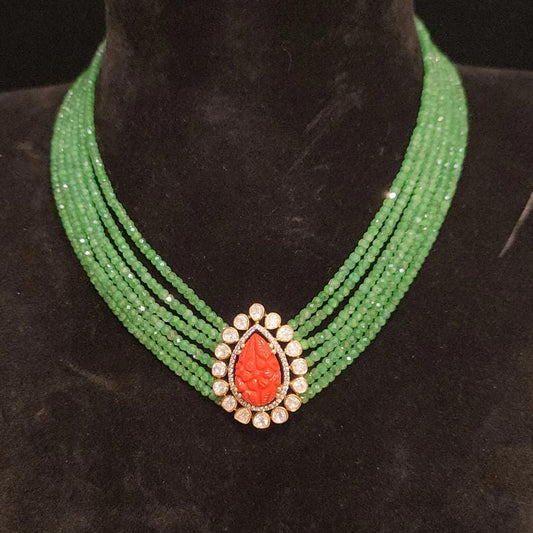 Swarovski CZ Green Beads Mala with 92.5 Silver Moissanite & Coral Pendant