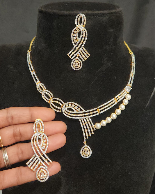 CZ Ribbon Necklace Set with Pearl