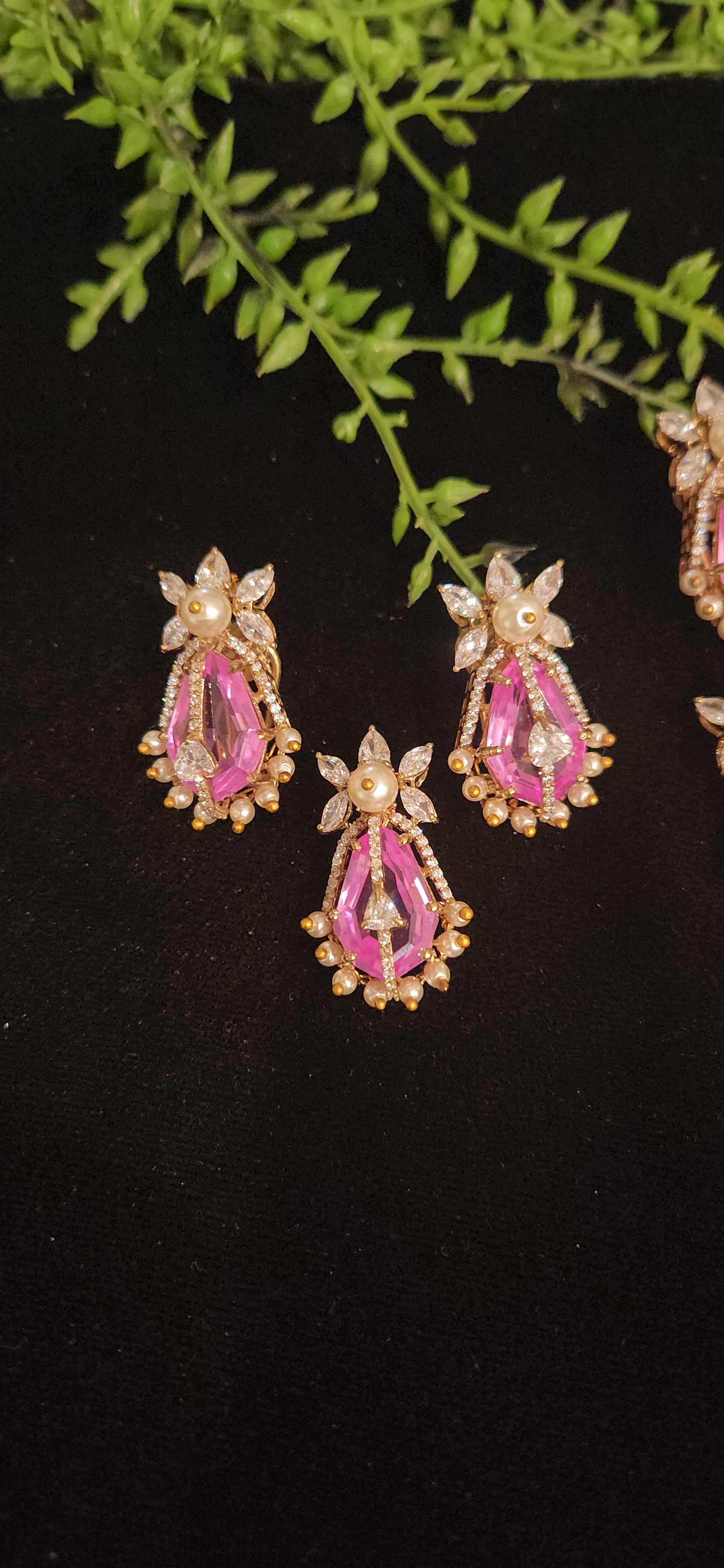 Does your look need a touch of royal sparkle? This beautiful set features a deep red ruby in a classic teardrop shape, surrounded by a bright star-inspired design made of shimmering stones. The matching star-shaped studs complete this elegant look, making it a perfect choice for anyone who loves high-end luxury and fine craftsmanship.