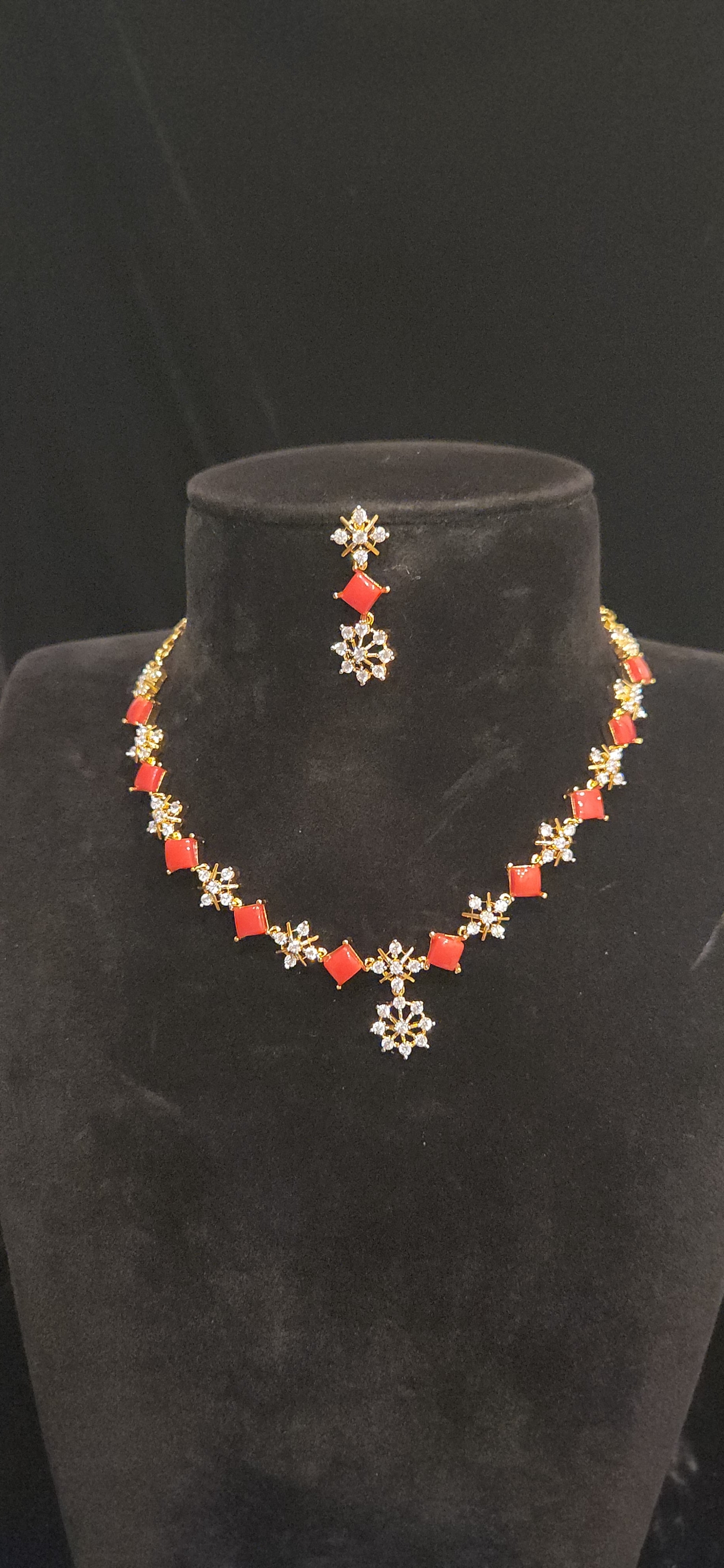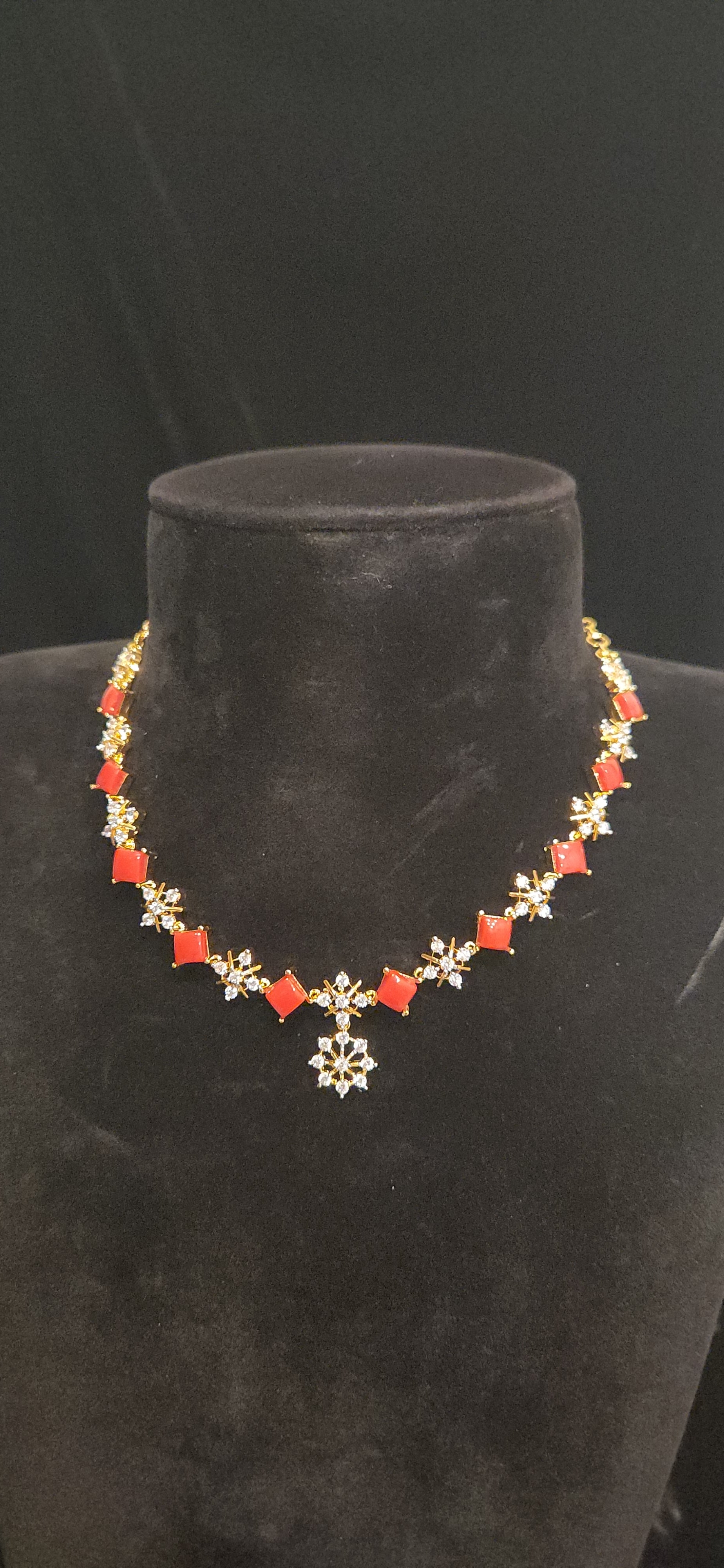 This striking necklace features a modern, rhythmic pattern of geometric rhombus-cut corals alternated with delicate floral motifs. The warm, earthy tones of the coral are beautifully contrasted by the intricate metalwork, creating a sophisticated balance between structured design and botanical charm. Complete with matching rhombus floral earrings, this set offers a unique, contemporary twist on traditional gemstone jewelry for any stylish occasion.