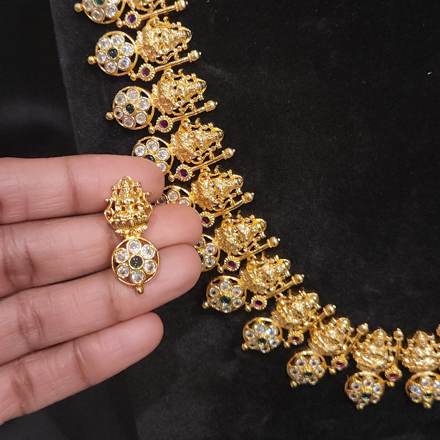 Step into a world of sacred tradition with this magnificent Long Haram, a masterpiece of temple-style jewelry. The necklace features a rhythmic progression of delicate floral motifs called Bottu each leading to a central, intricately embossed Goddess Lakshmi pendant—the symbol of prosperity and grace. Its elongated silhouette creates a regal drape, while the matching earrings echo the divine floral craftsmanship. This set is an essential treasure for brides and connoisseurs of classic South Indian heritage.