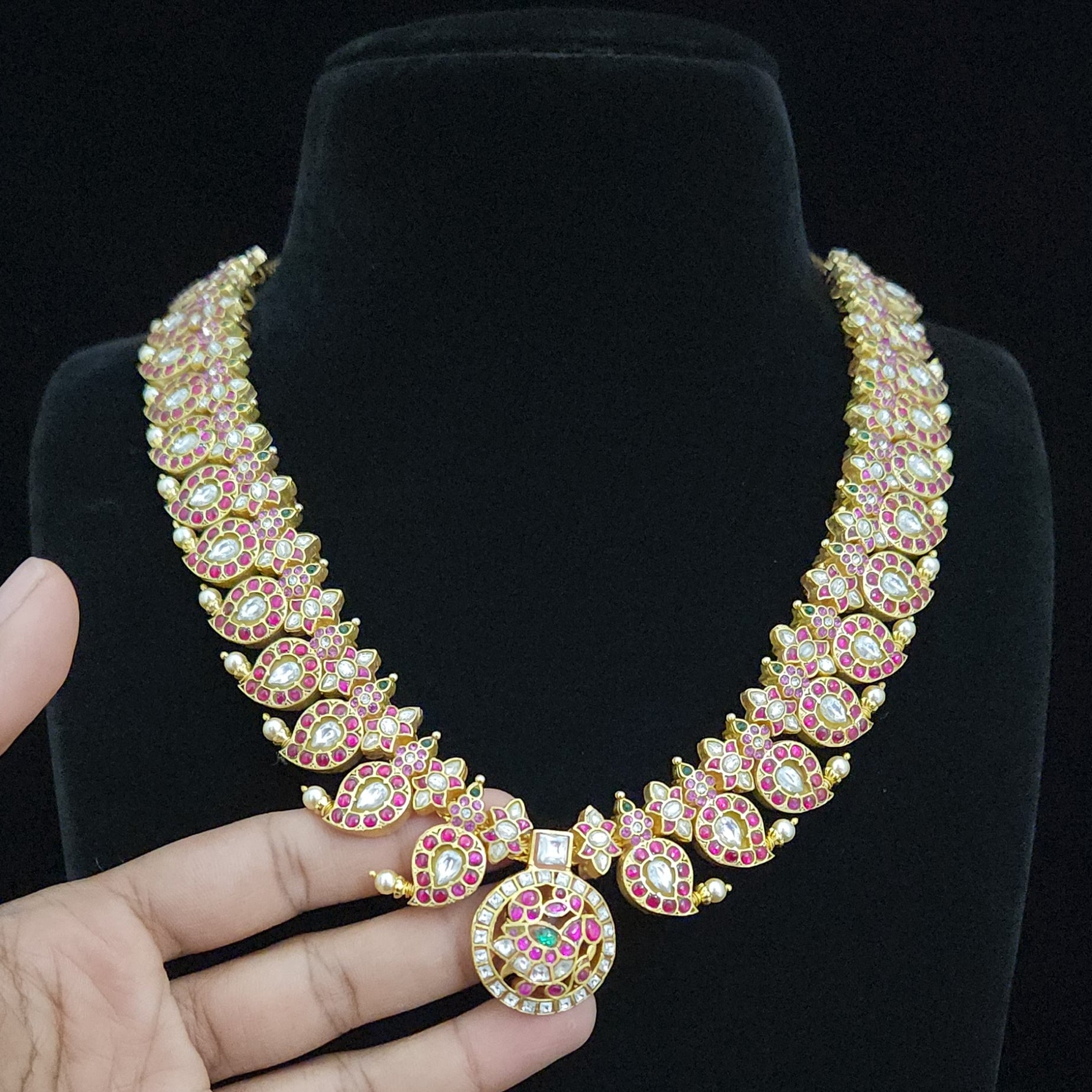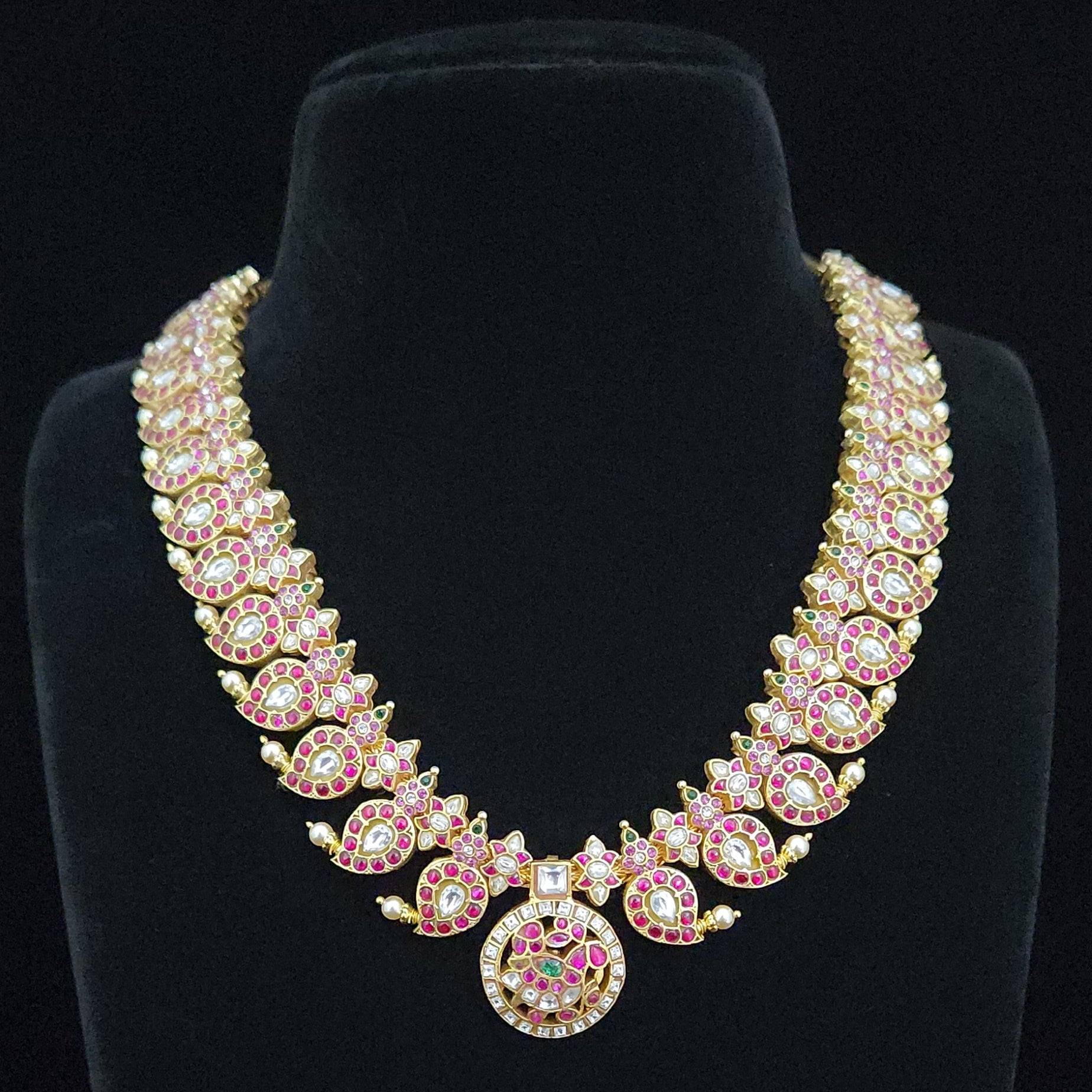 Celebrate the timeless beauty of South Indian tradition with this exquisite short Haram, featuring the iconic Manga Malai (mango motif) design. Each motif is meticulously inlaid with traditional Jadau Kundan stones, creating a seamless blend of antique charm and opulent radiance that sits perfectly at the collarbone.