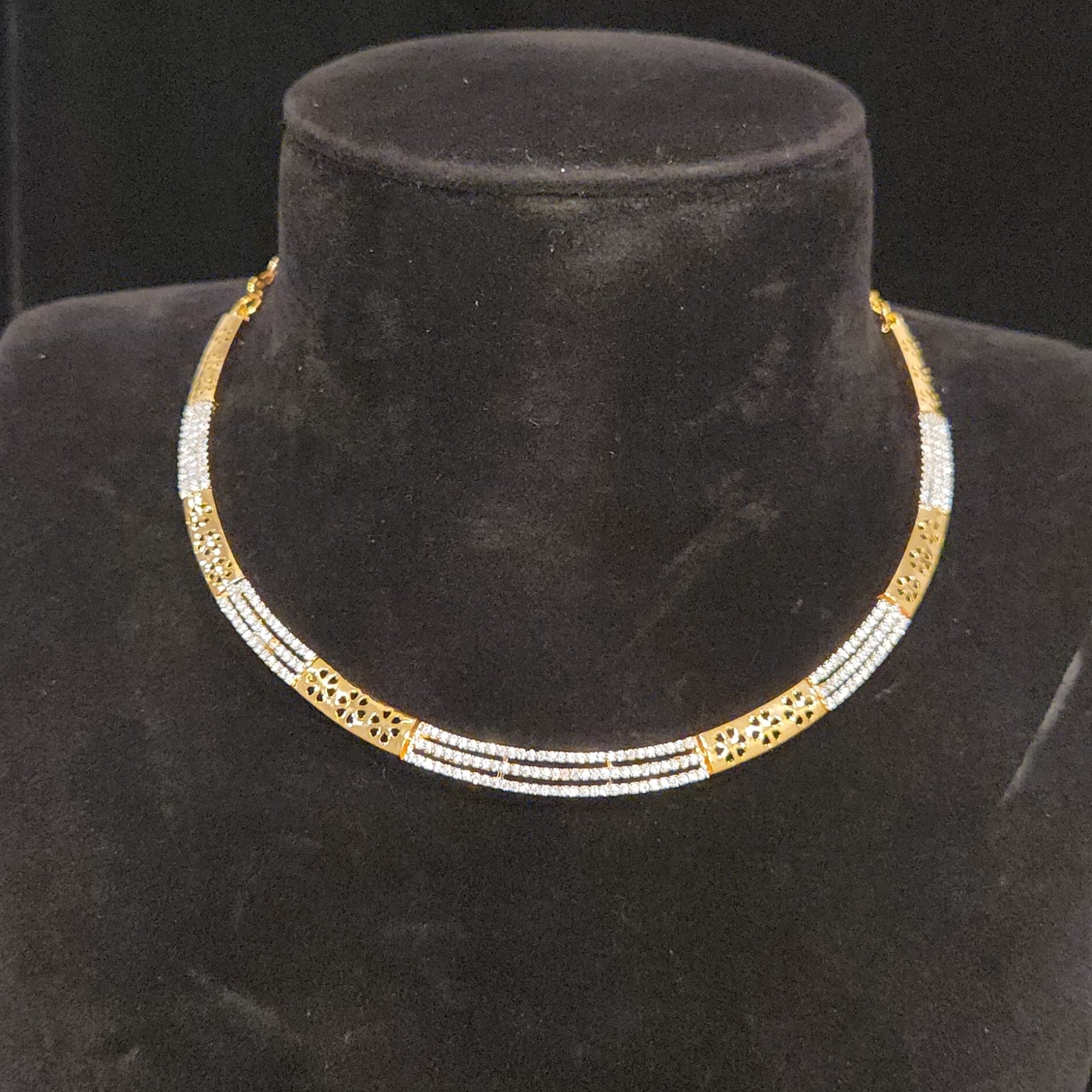Blooming CZ Brilliance. This chic gold-finish kante features a structured collar design adorned with sparkling cubic zirconia floral motifs and paired with matching minimalist studs. The sleek fusion of a modern choker silhouette with delicate botanical detailing makes it an effortless choice for festive parties, contemporary ethnic wear, or upscale social gatherings.