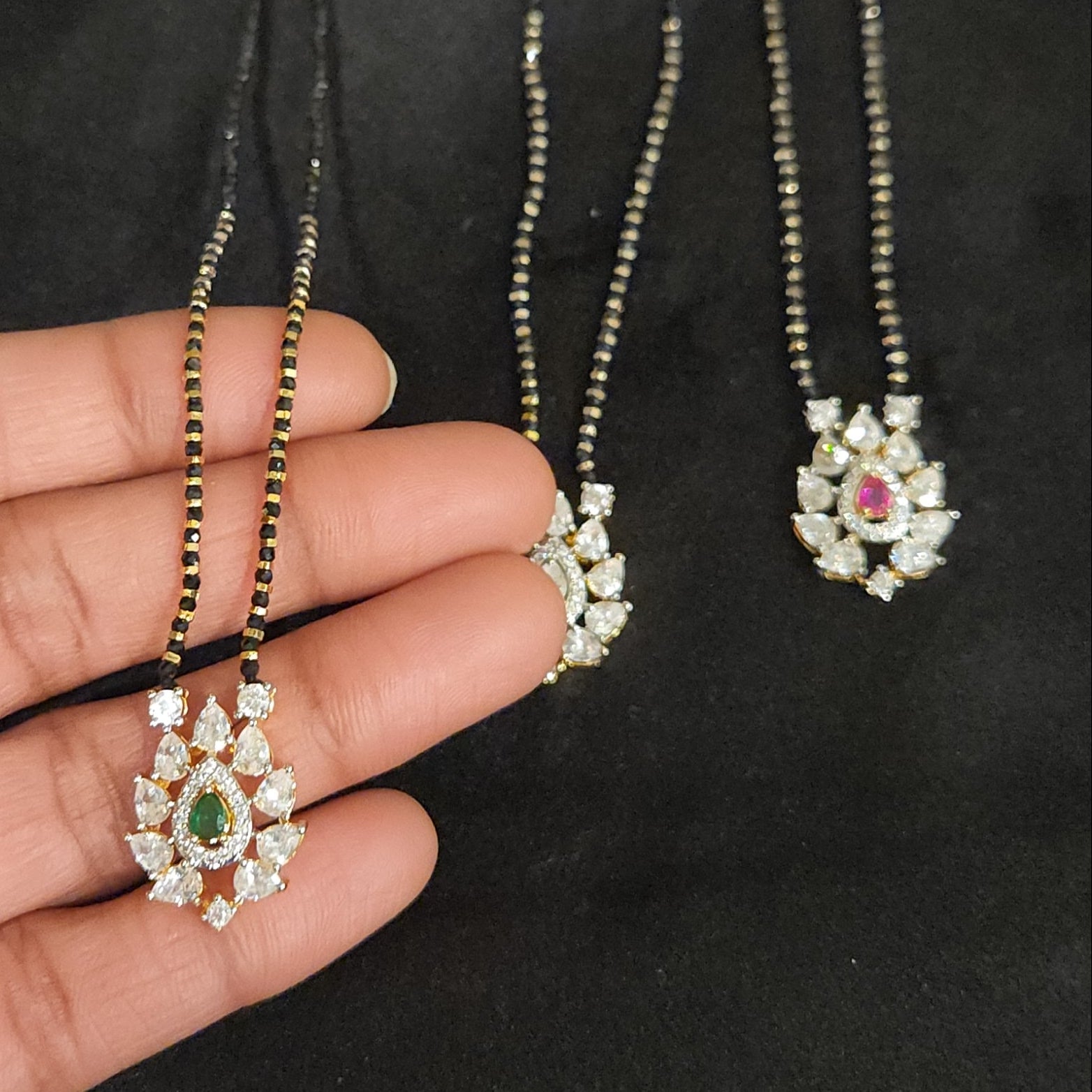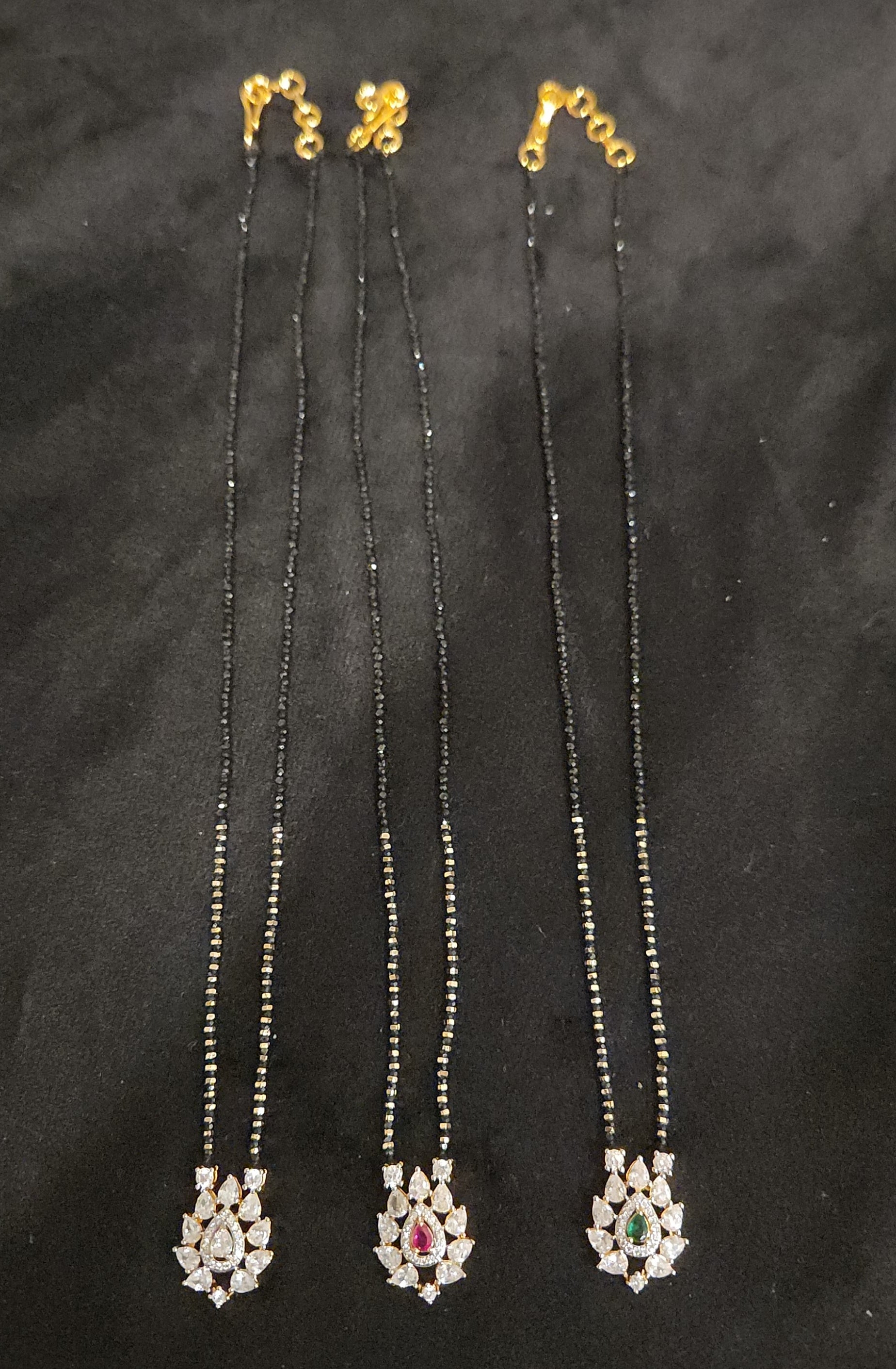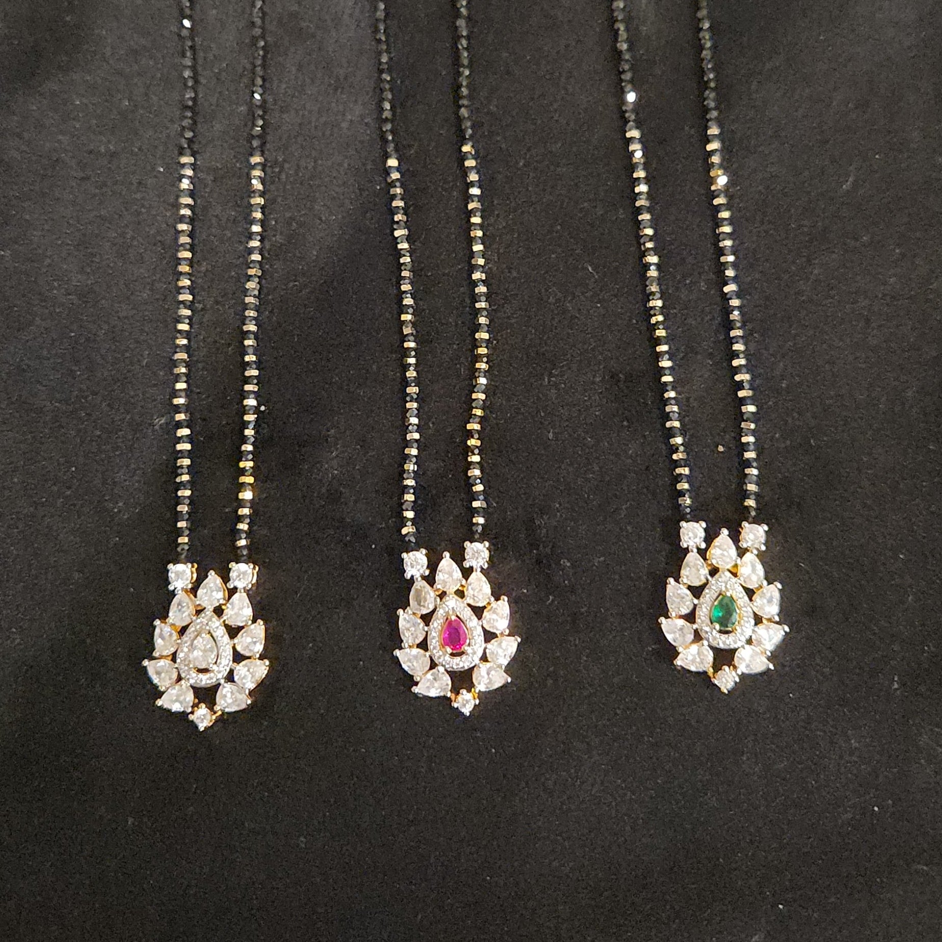 Exquisite Designer Sophistication. This versatile set features a meticulously crafted tear drop cz pendant on a traditional black beads chain with matching studs, available in three distinct design variants. It offers a premium sparkle and tailored elegance that makes it a perfect accessory for corporate events, celebratory lunches, or everyday luxury wear.