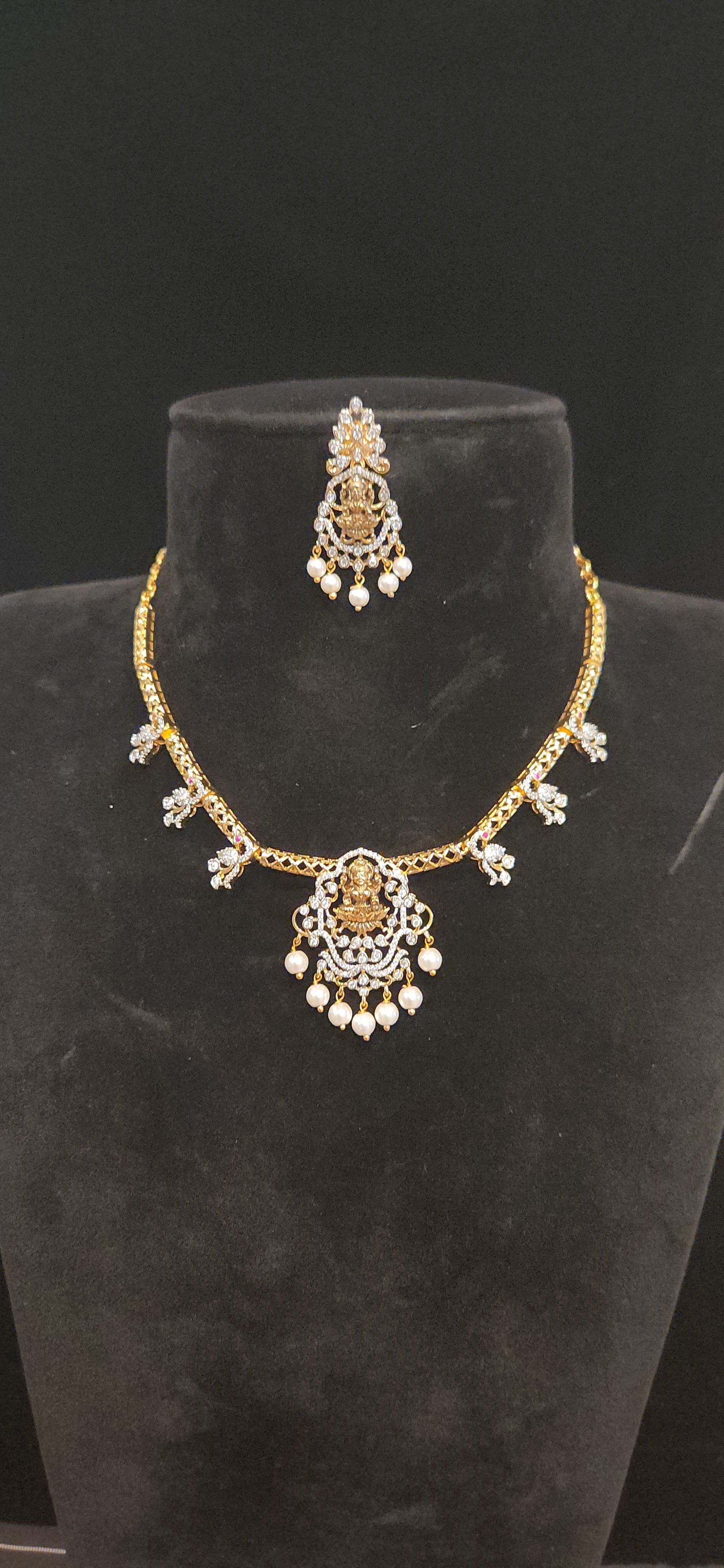 Invoke prosperity with this sacred masterpiece! This necklace set features a beautifully detailed Lakshmi Devi Pendant surrounded by elegant Leaf Motifs and paired with Matching Earrings. Its traditional design and intricate craftsmanship make it an essential accessory for Weddings, Temple Visits, and Festive Celebrations.