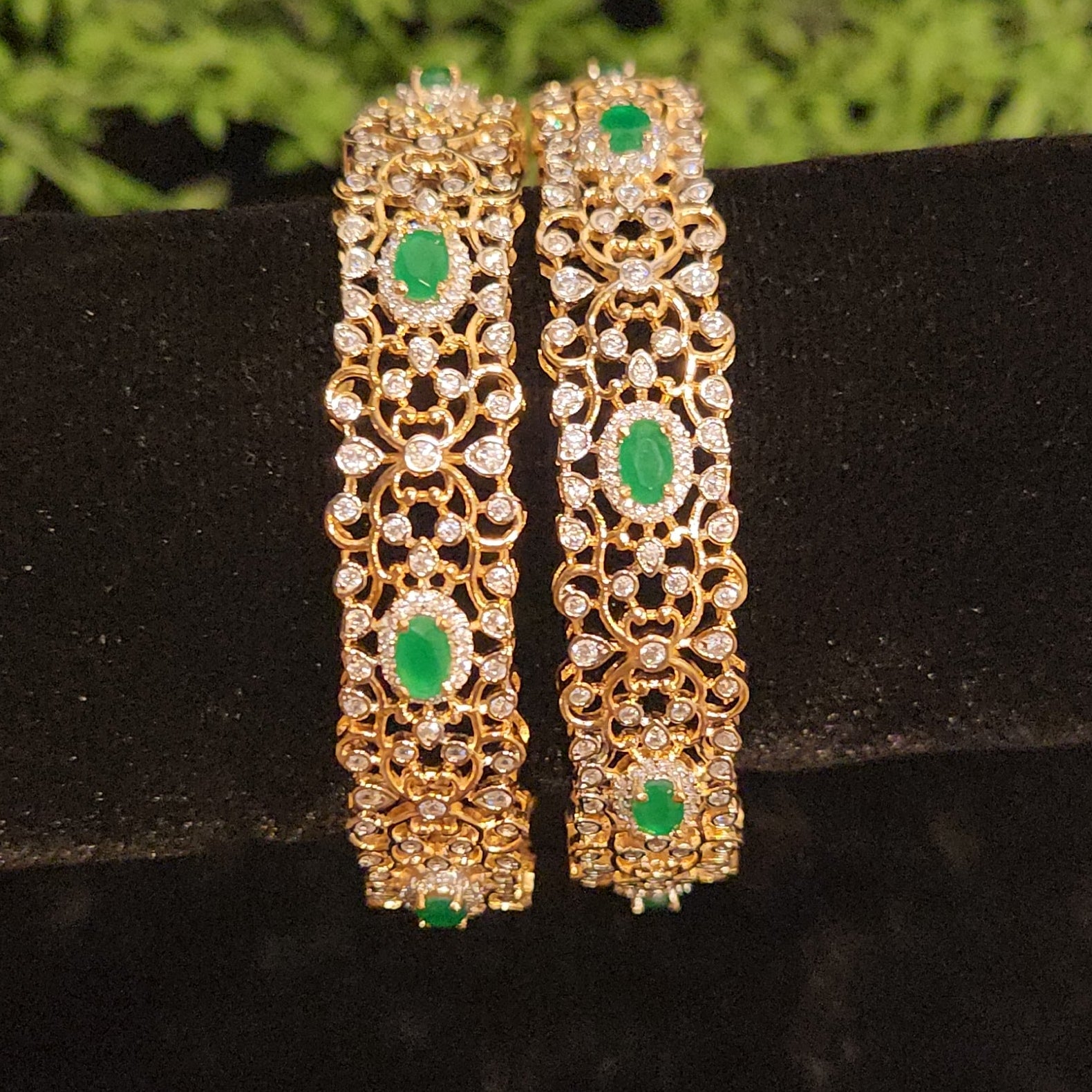 Luminous Garden Elegance. These designer diamond-finish bangles showcase intricate floral patterns embellished with high-grade CZ stones, available in two opulent variants: ruby and emerald. The precision-cut stones and sleek finish provide a sophisticated shimmer that perfectly complements gala attire or bridal ensembles.