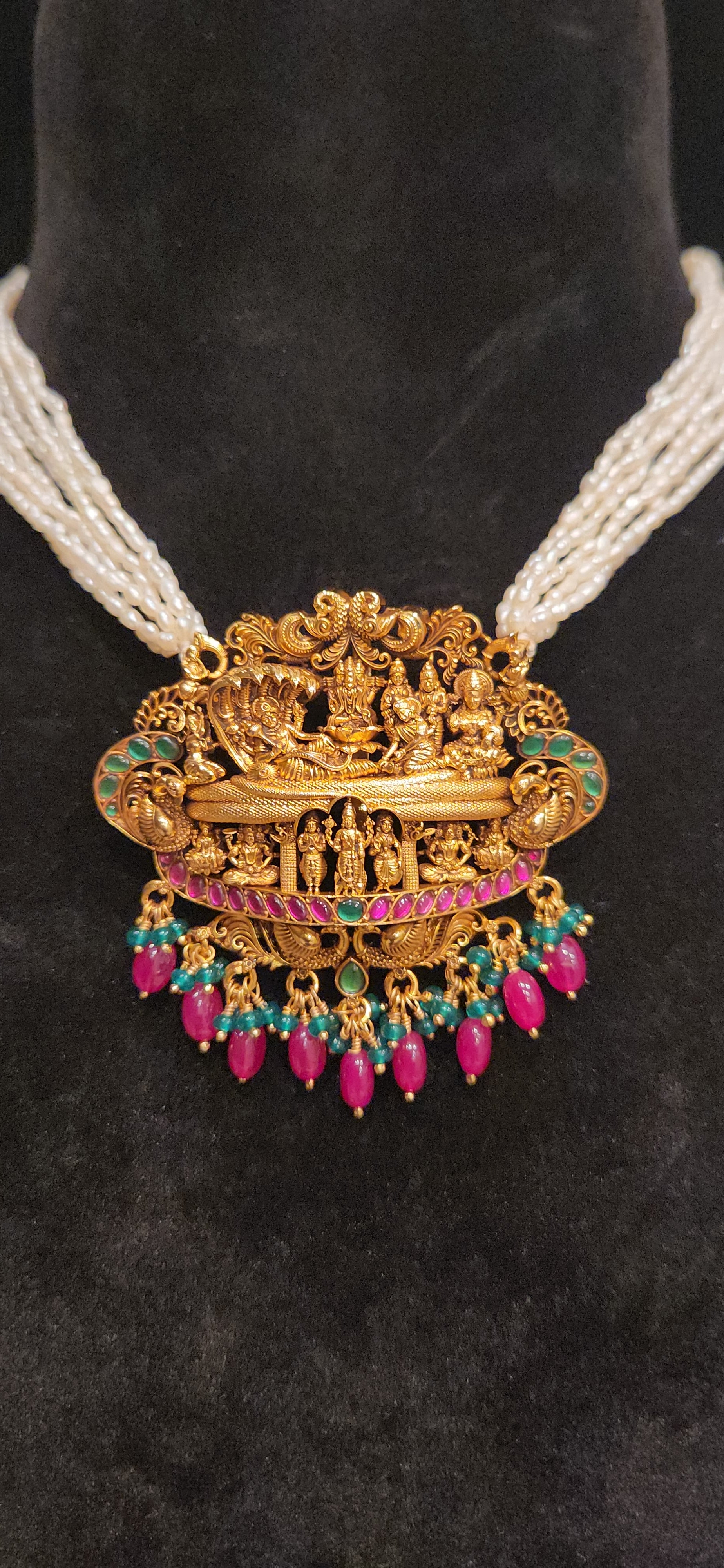 Want versatile style with nature’s charm? Exquisitely handcrafted 92.5 silver necklace featuring intricate Dasavatar temple carvings, antique finish, layered pearl strands, and vibrant pink-green bead drops. A stunning heritage piece perfect for weddings, festive occasions, and traditional celebrations.
