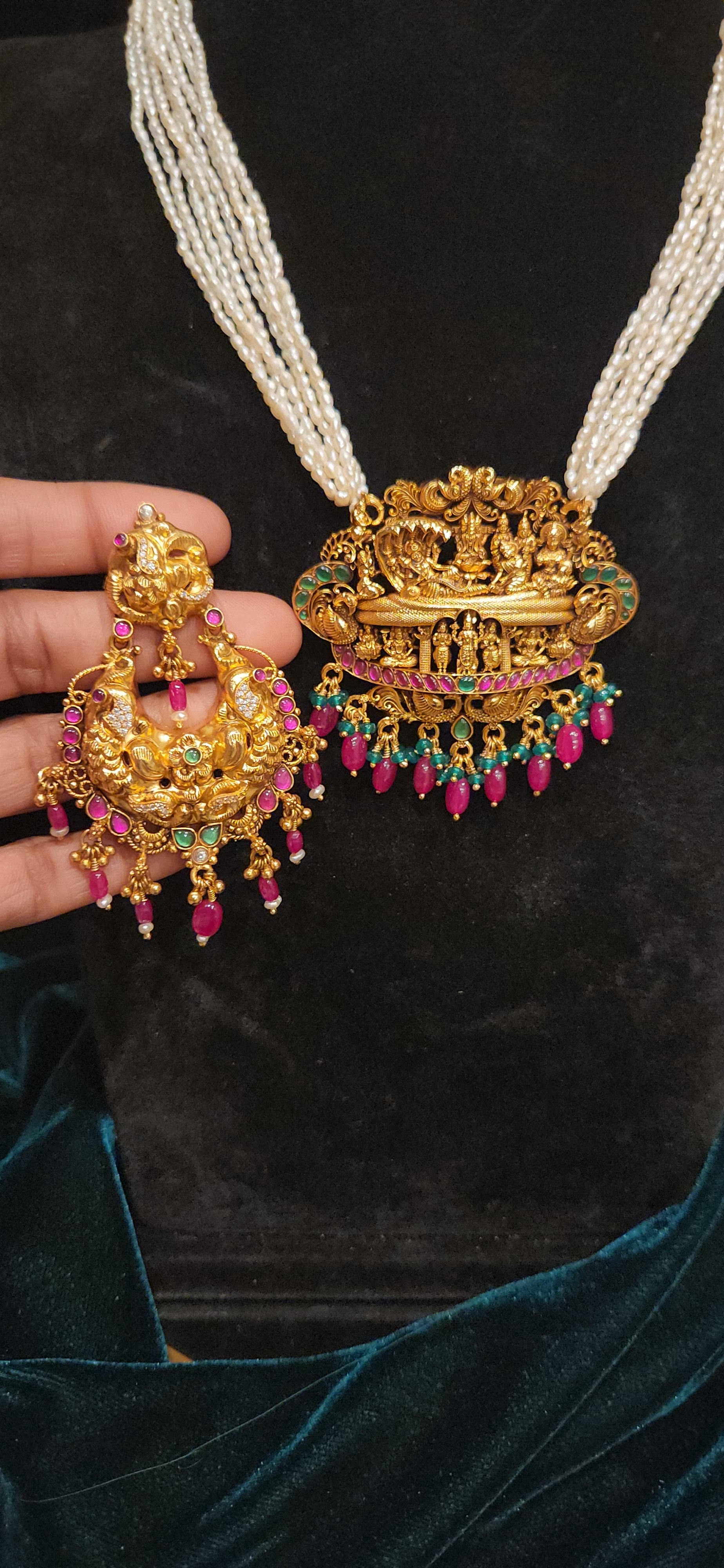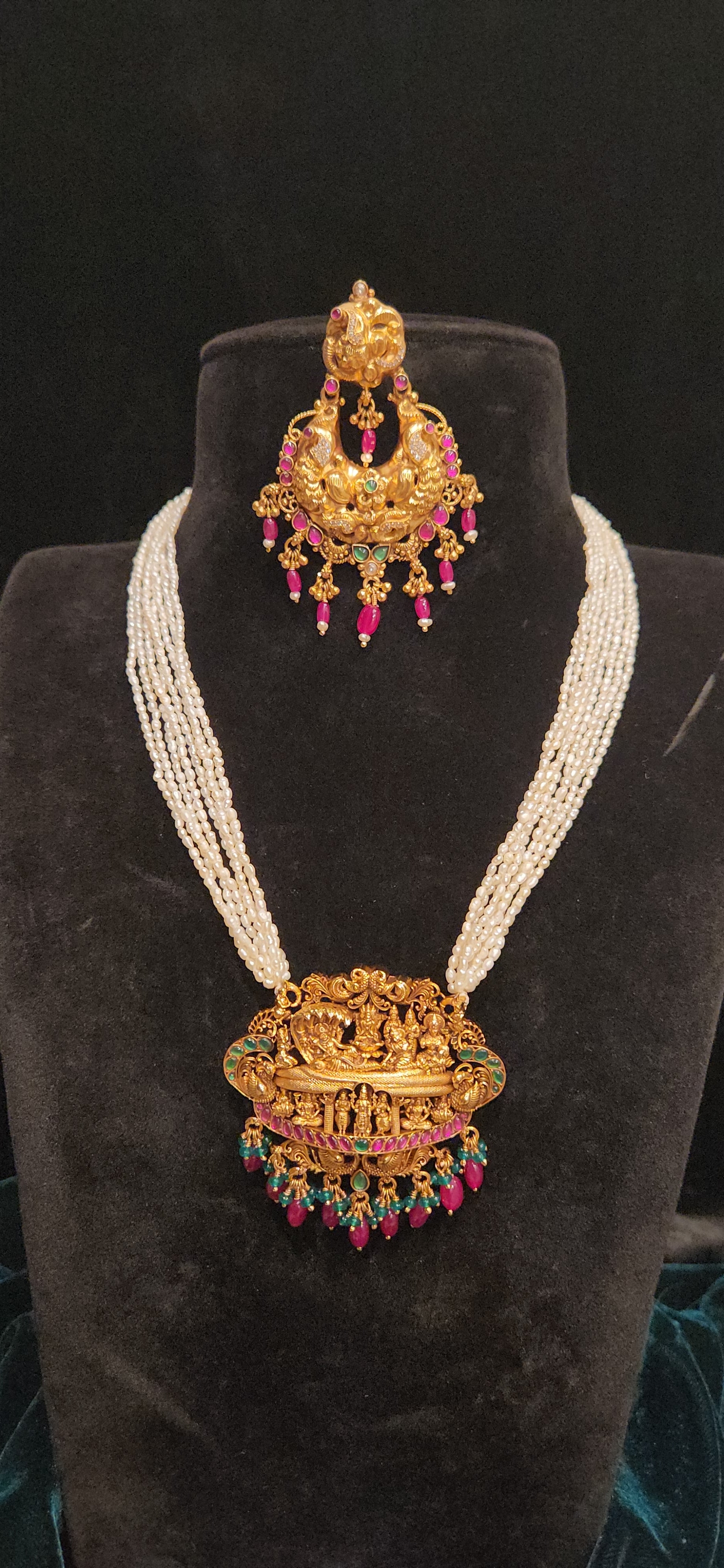 92.5 Silver Dasavatar Temple Pearl Necklace Set