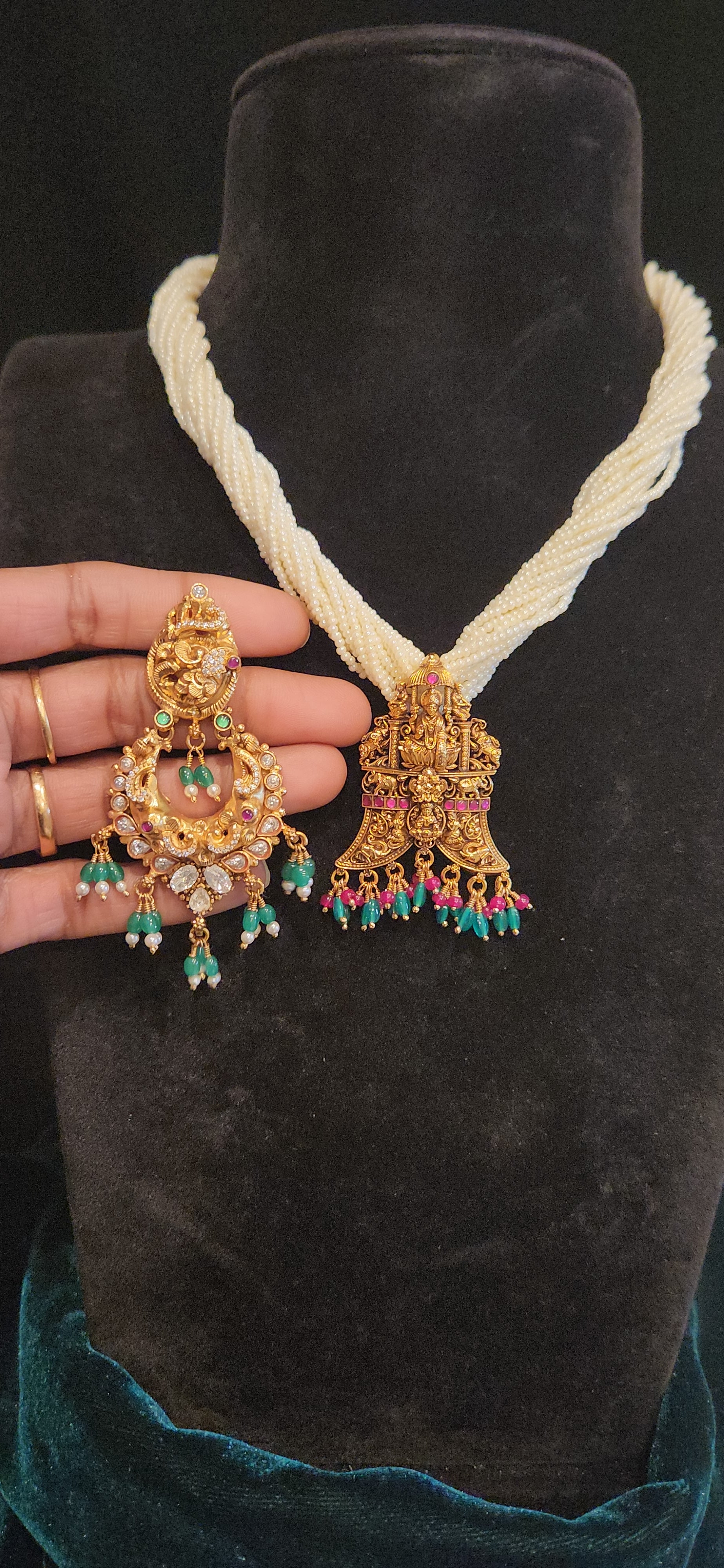 92.5 Silver Tiger Nail Lakshmi Pendant Pearl Necklace with Matching Earrings