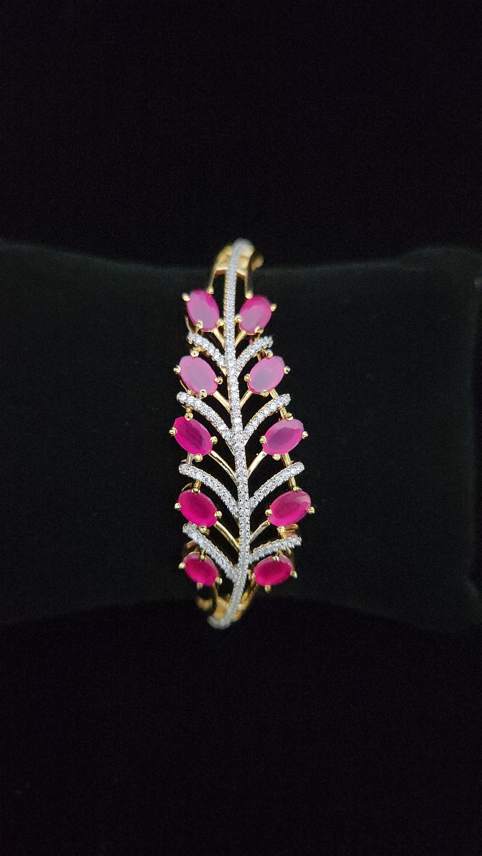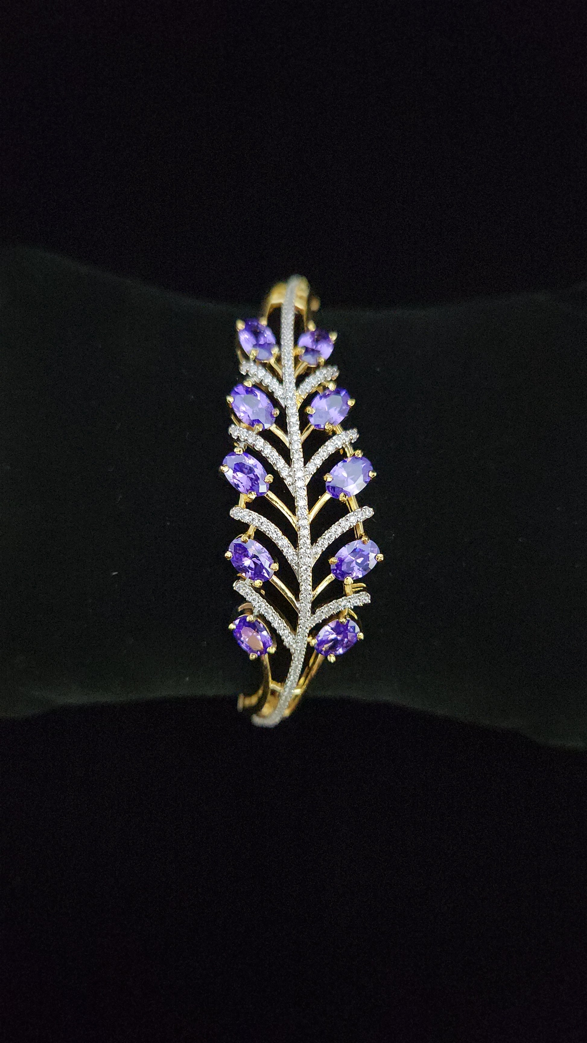 Elegant and Contemporary wristwear featuring a graceful nature-inspired motif. This Designer Bracelet showcases a detailed Feather Design. It is brilliantly accented with dazzling CZ and rich Violet Stones. Perfect for Fashion or Evening Wear adding a subtle pop of color and sophistication.