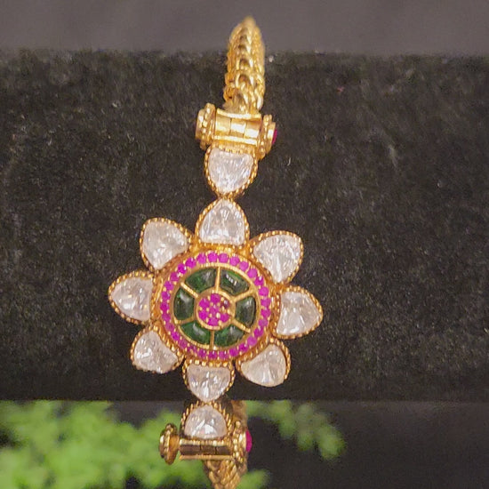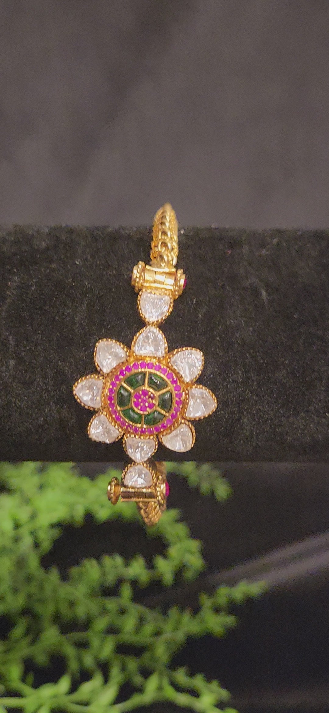 A stunning openable kada adorned with sparkling multi-color moissanite stones and elegant floral detailing. Its vibrant look and easy-to-wear design make it perfect for festive and special occasions.