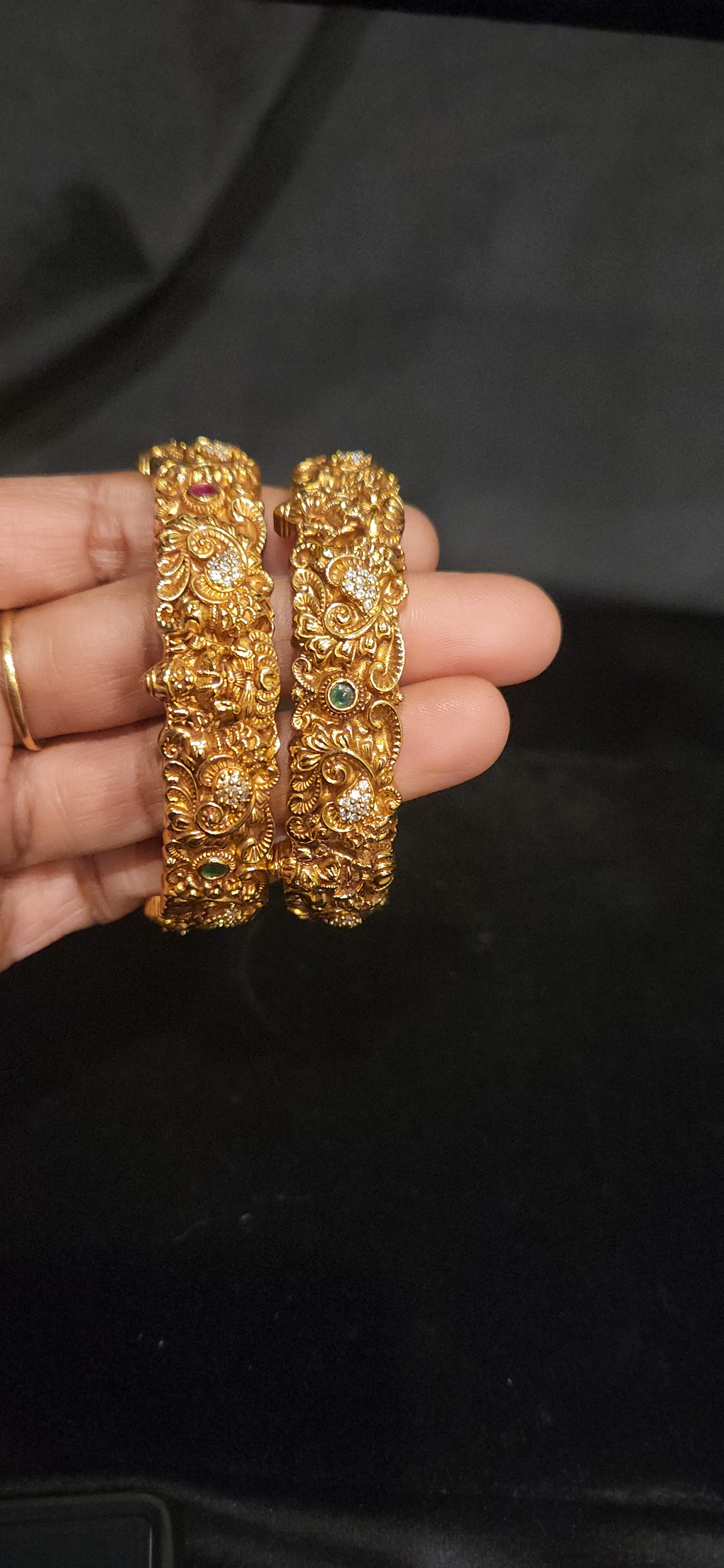These elegant bangles feature beautifully crafted Lakshmi motifs in traditional nakshi work, paired with classic mango (manga) designs that symbolize prosperity and good fortune. The antique finish adds a rich, timeless look, making them perfect for weddings, festivals, and traditional outfits. A stunning blend of heritage craftsmanship and graceful style.