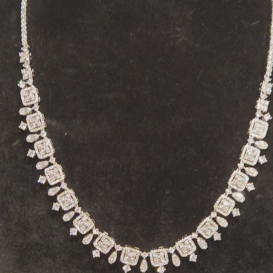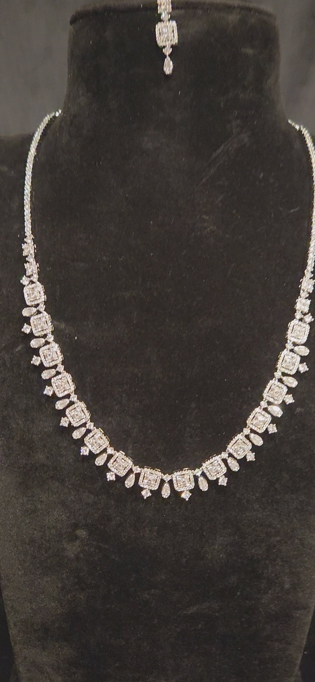 Seeking ultra-modern sparkle? This designer necklace set features brilliant Moissanite and CZ Square stones with elegant dangle earrings. It is the ultimate luxury accessory for Black-Tie Events, Upscale Galas, or Wedding Receptions.
