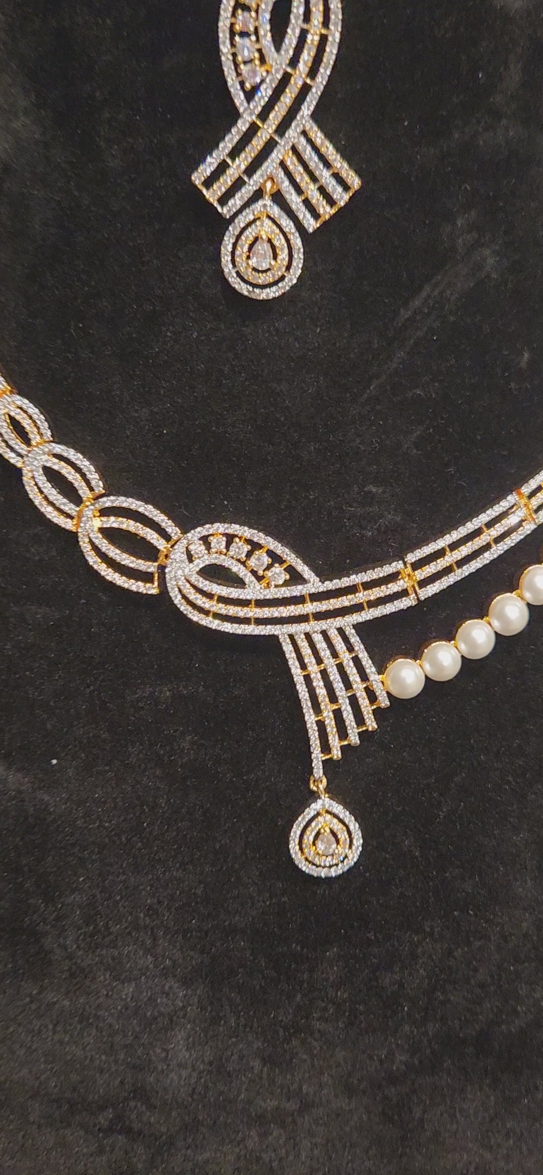 Seeking delicate, fluid elegance? This CZ Necklace Set with matching earrings features a graceful Ribbon Design adorned with sparkling stones and soft pearl accents. It is the perfect subtle glamour for Formal Dinners, Cocktail Receptions, or Anniversary Celebrations.