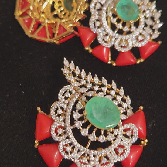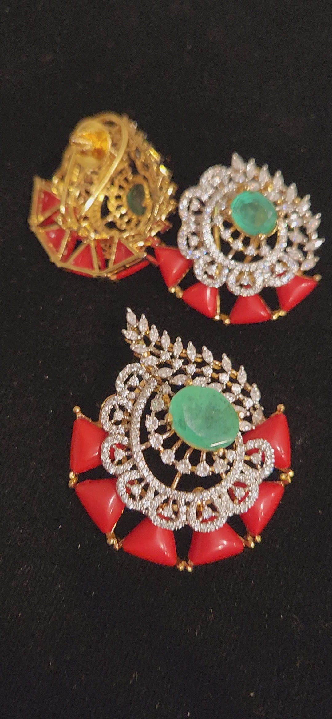 Seeking unique color contrast? This stylish Pendant Set features striking Triangled coral beads and vibrant Emerald (Green) stones for a bold look. It's a perfect contemporary accessory for Casual Brunches, Day-time Festive Functions, or Resort Wear.