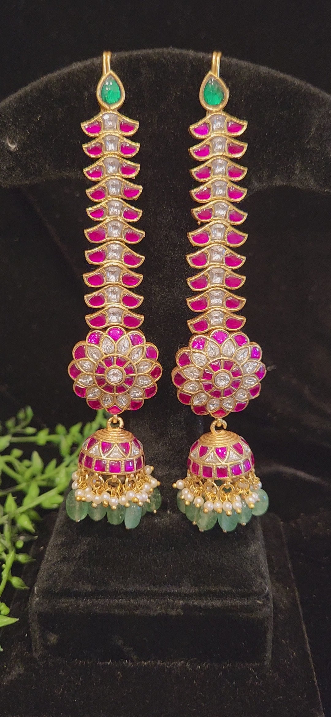 Looking for a complete traditional bridal accessory? These exquisite Kundan Jhumkas with the traditional Maati (ear chain/support), offering secure wear and a complete, opulent look. This stunning, Heirloom Style accessory is perfect for Wedding Functions, Grand Festivals, or Formal Ethnic Events.