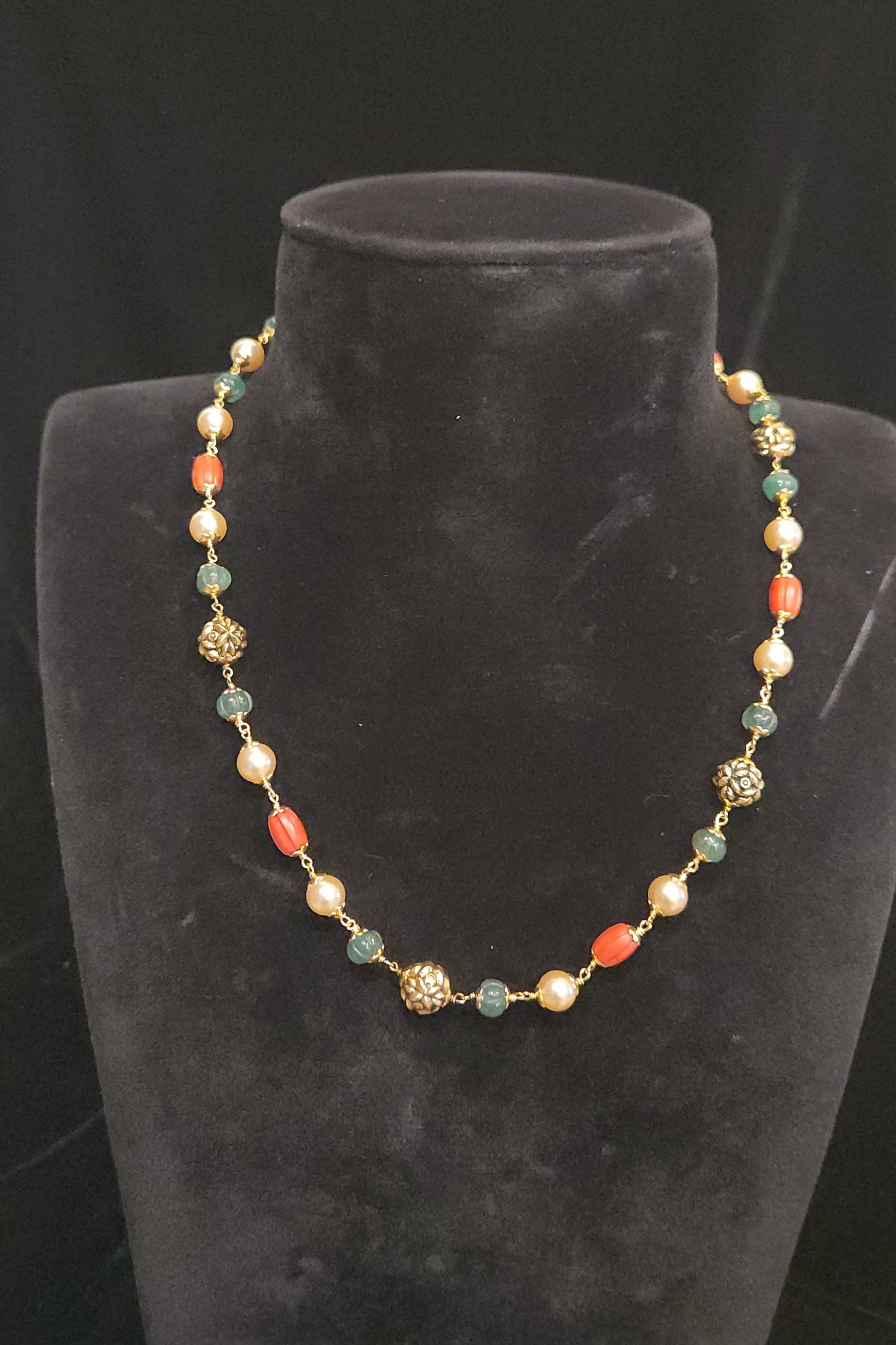 A luxurious and vibrant blend of texture and color! This Vibrant Mala is crafted using Four Different Kinds of Beads for a rich look: smooth Pearls, bright Coral, earthy Pumpkin Beads, and gleaming Nakshi Balls. This combination creates a striking and traditional statement piece. Perfect for complementing silk sarees and grand festive occasions. And also can be paired with detachable pendant sets.