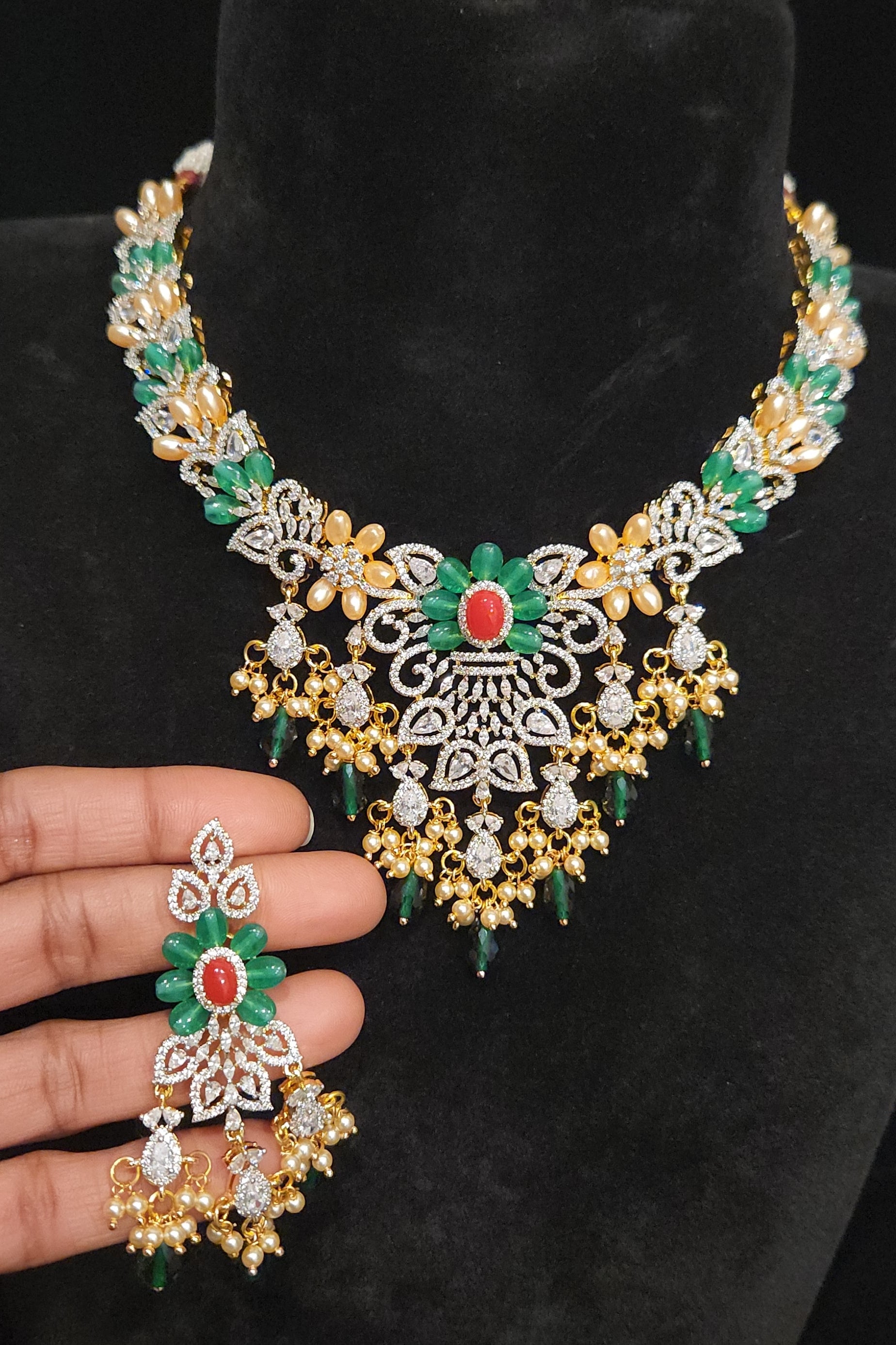 Artistic Coral, Green & Gold Bead Flower Necklace Set