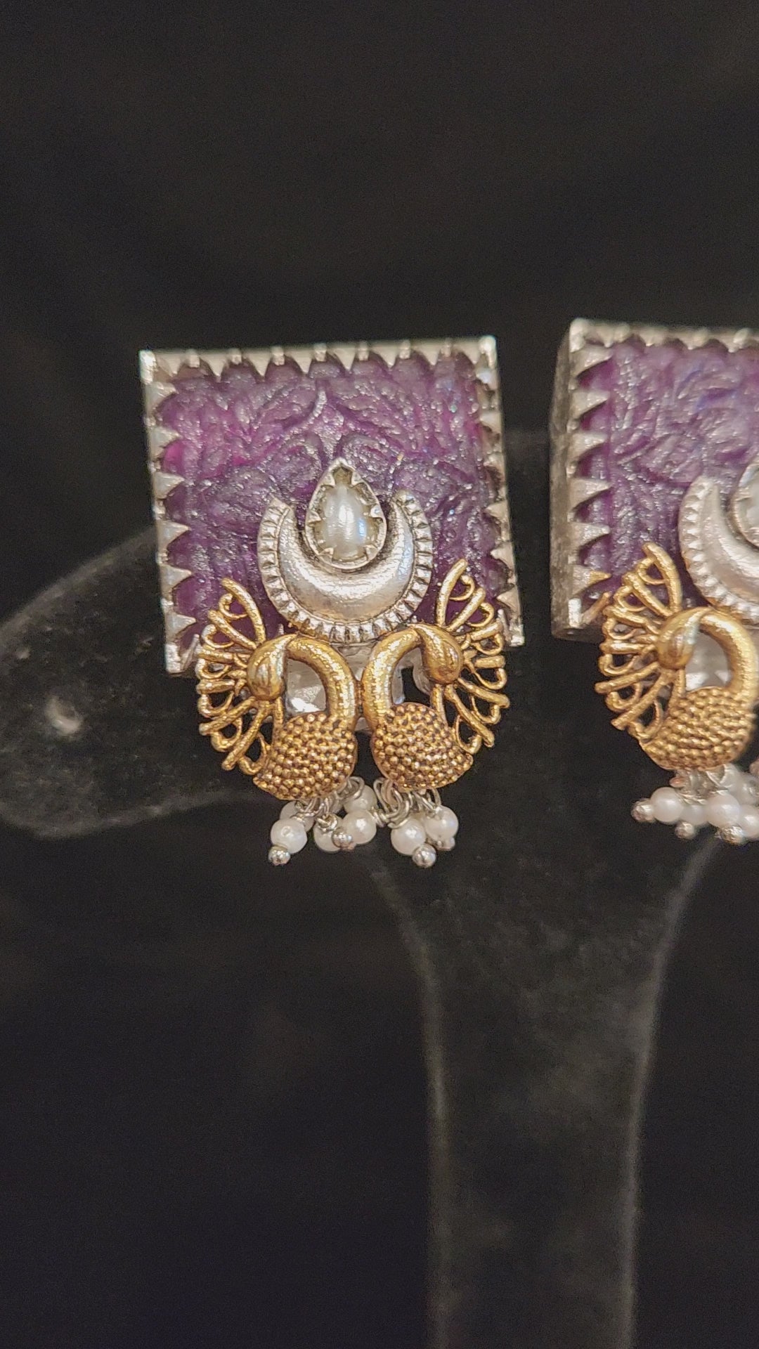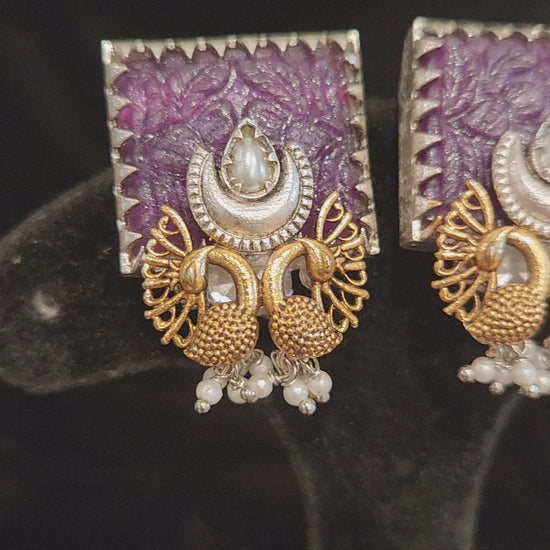 Ready to wear something truly unique? These stunning German Silver Fusion Studs feature a striking Peacock design centered with a beautiful Violet Square Stone, adding a touch of vibrant, exotic flair to your look. This beautiful, Designer Piece is perfect for Holiday Gatherings, Festive Events, or Unique Formal Occasions.