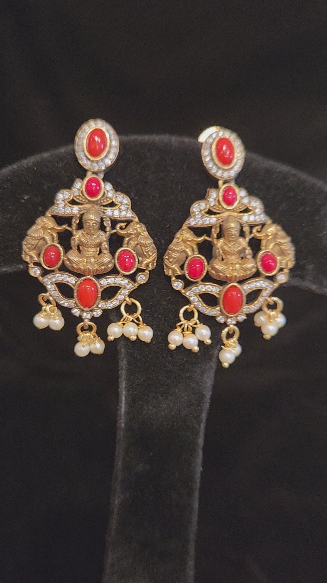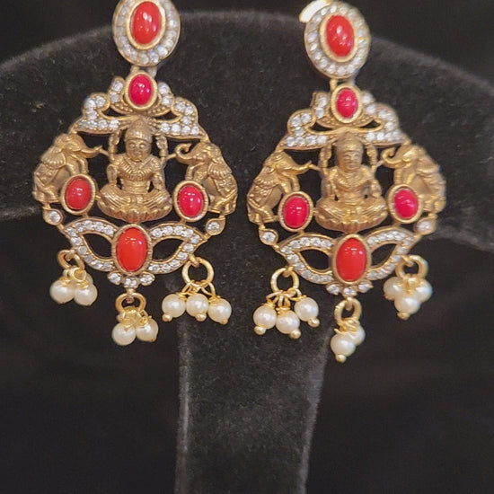 Want to invite grace and good fortune? These beautiful Antique Finish Earrings feature a detailed Lakshmi Devi and Elephant motif with rich Coral accents and delicate pearl hangings for a traditional, opulent look. This exquisite, Temple Jewelry accessory is perfect for Pooja Ceremonies, Cultural Festivals, or Traditional Weddings.