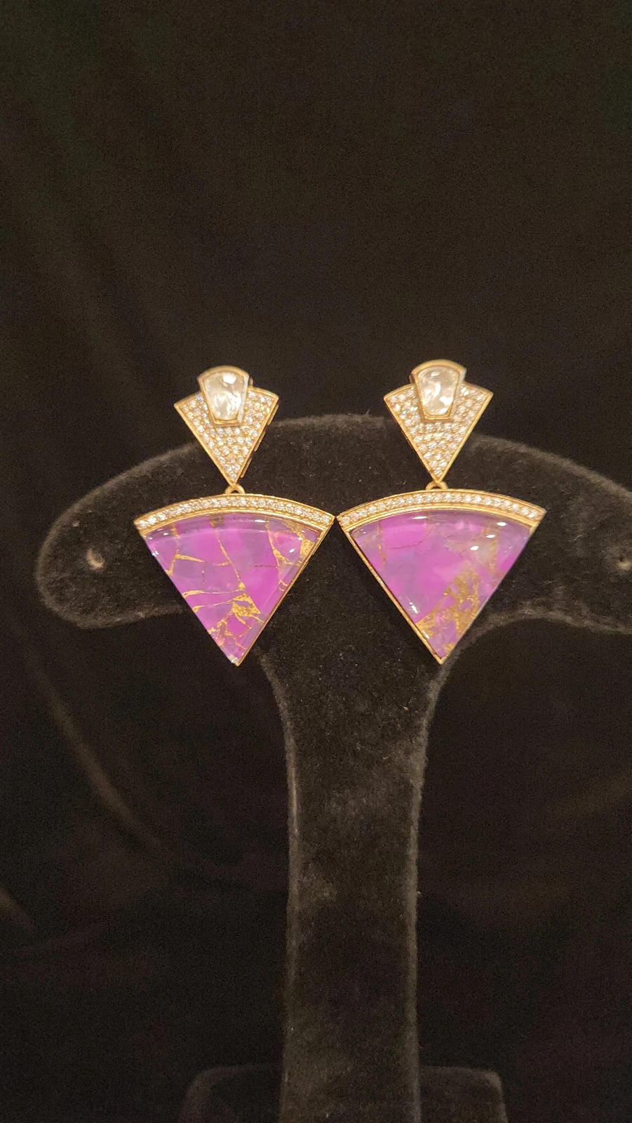 Want a modern look with luxurious sparkle? These gorgeous Gold Finish earrings feature a striking Cone Shape design set with brilliant CZ and Fire Stone, offering a sophisticated, unique style. This stunning, Designer Piece is perfect for Cocktail Parties, Elegant Dinners, or Special Occasions.