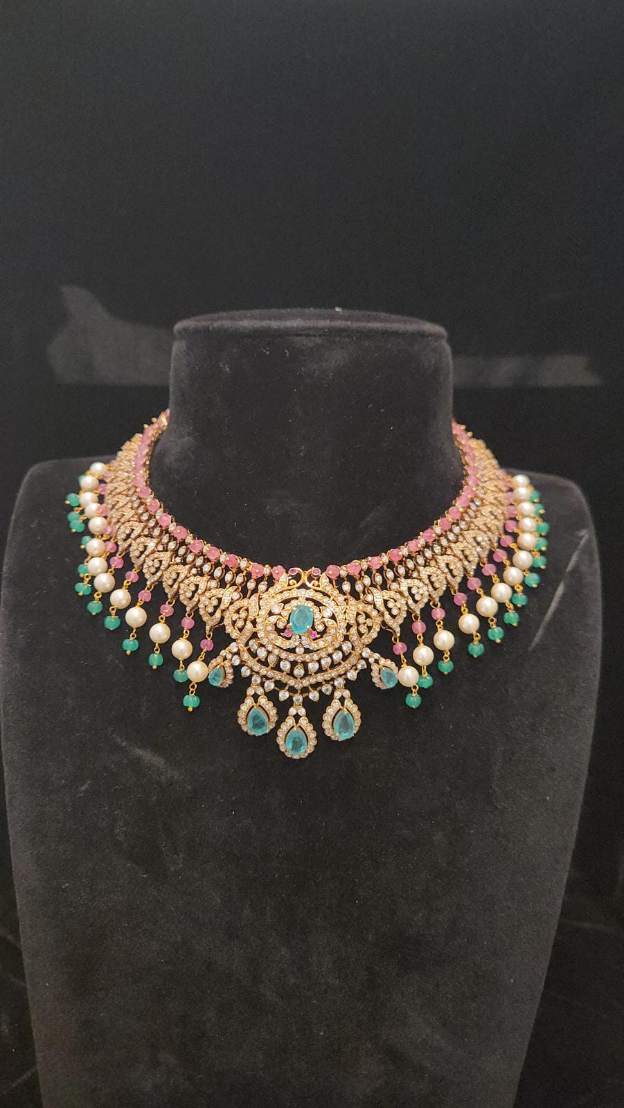 Celebrate the divine elegance of the festive season! This intricately crafted 92.5 silver neckset in Victorian finish is adorned with ruby and emerald pumpkin beads. This unique piece is perfect for Varalakshmi Vratham and beyond, blending traditional grace with modern charm. It completes your look with regal sophistication for any silk saree or classic lehenga.