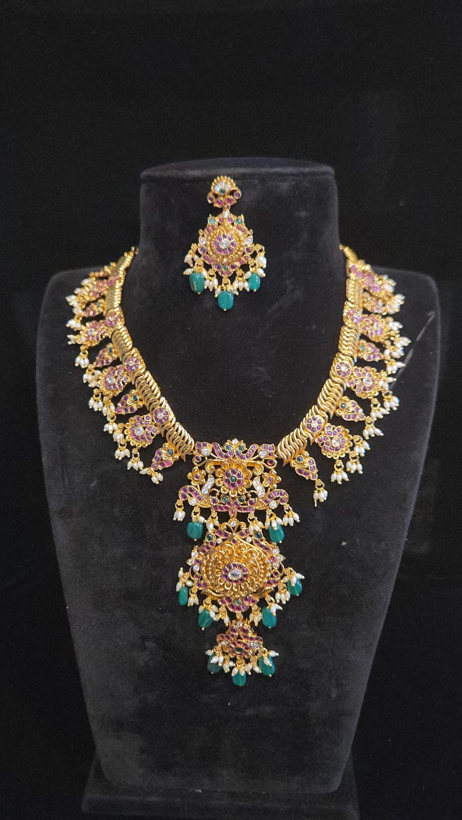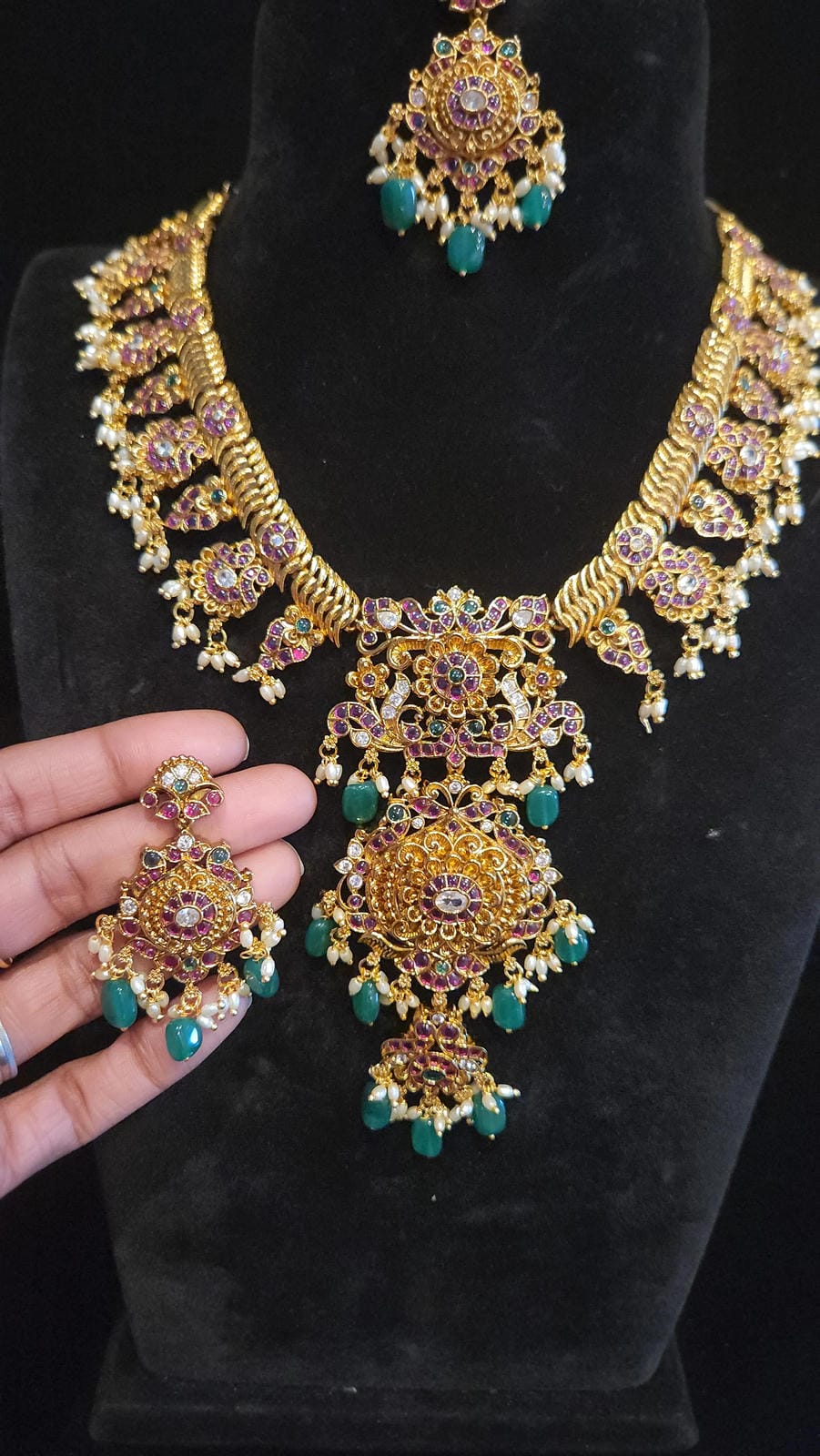 Maximize your look with this versatile Matt Finish Necklace Set, featuring an intricate Jelabi chain, a dazzling Kemp floral design, and a Detachable Pendant for endless styling options, complete with matching earrings. This truly Adaptable Luxury set is perfect for Day Events and Receptions