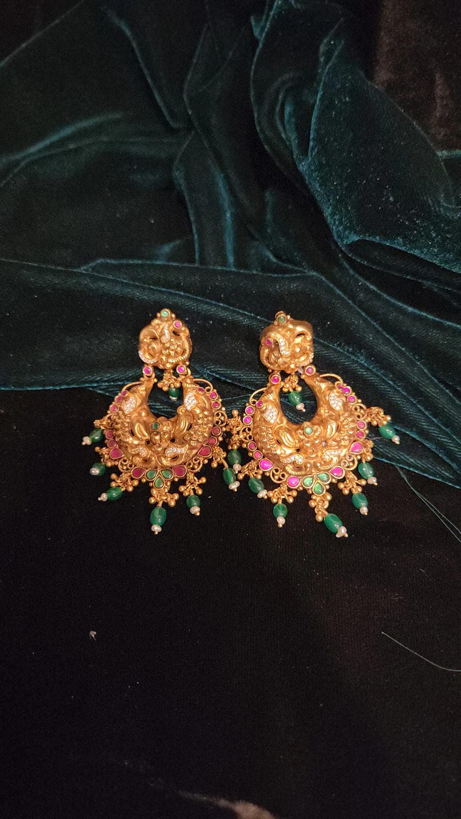 Intricately designed with 3D Lord Ganesha, Shiva and Parvathi motifs symbolizing prosperity and blessings, paired with majestic peacock abd elephant detailing, this masterpiece radiates grandeur. What makes it truly unique? The set is adorned with real emerald beads and lustrous gold-plated ball hanging delicately, adding a rich touch of royalty and grace.