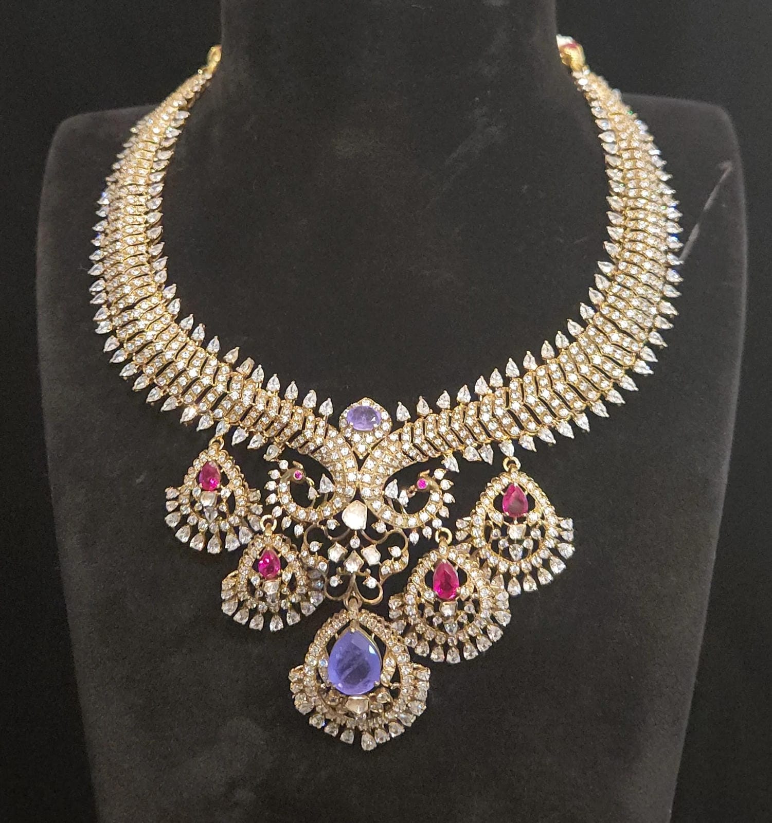 Unveiling our 92.5 Silver Victorian Finish Kante Set, adorned with a stunning ruby and purple stone combination, intricately crafted with sparkling Mossanites and CZ stones.