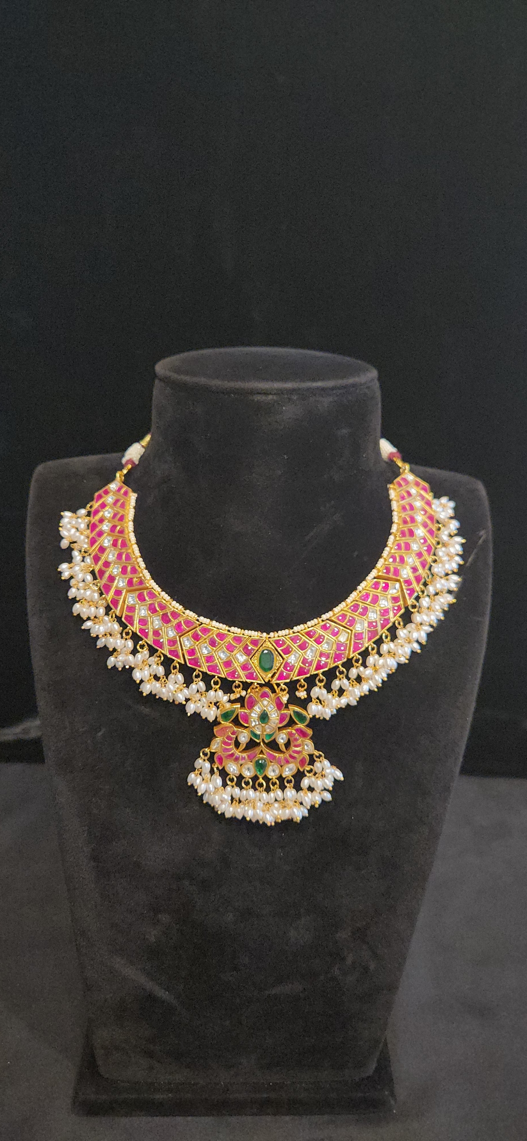 Is your bridal or festive wardrobe ready for a masterpiece of heritage craftsmanship? This exquisite treasure showcases a regal Guttapusalu silhouette, a traditional South Indian design characterized by luscious clusters of small pearls that resemble a "shoal of fish." Meticulously handcrafted using Jadau techniques, where shimmering Kundan stones are expertly set into gold foil, these sets define boutique-jewelry excellence for grand weddings, receptions, and cultural celebrations